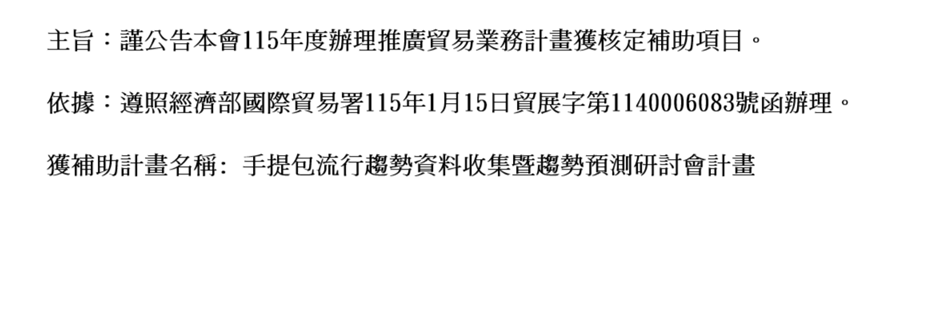 謹公告本會115年度辦理推廣貿易業務計畫獲核定補助項目