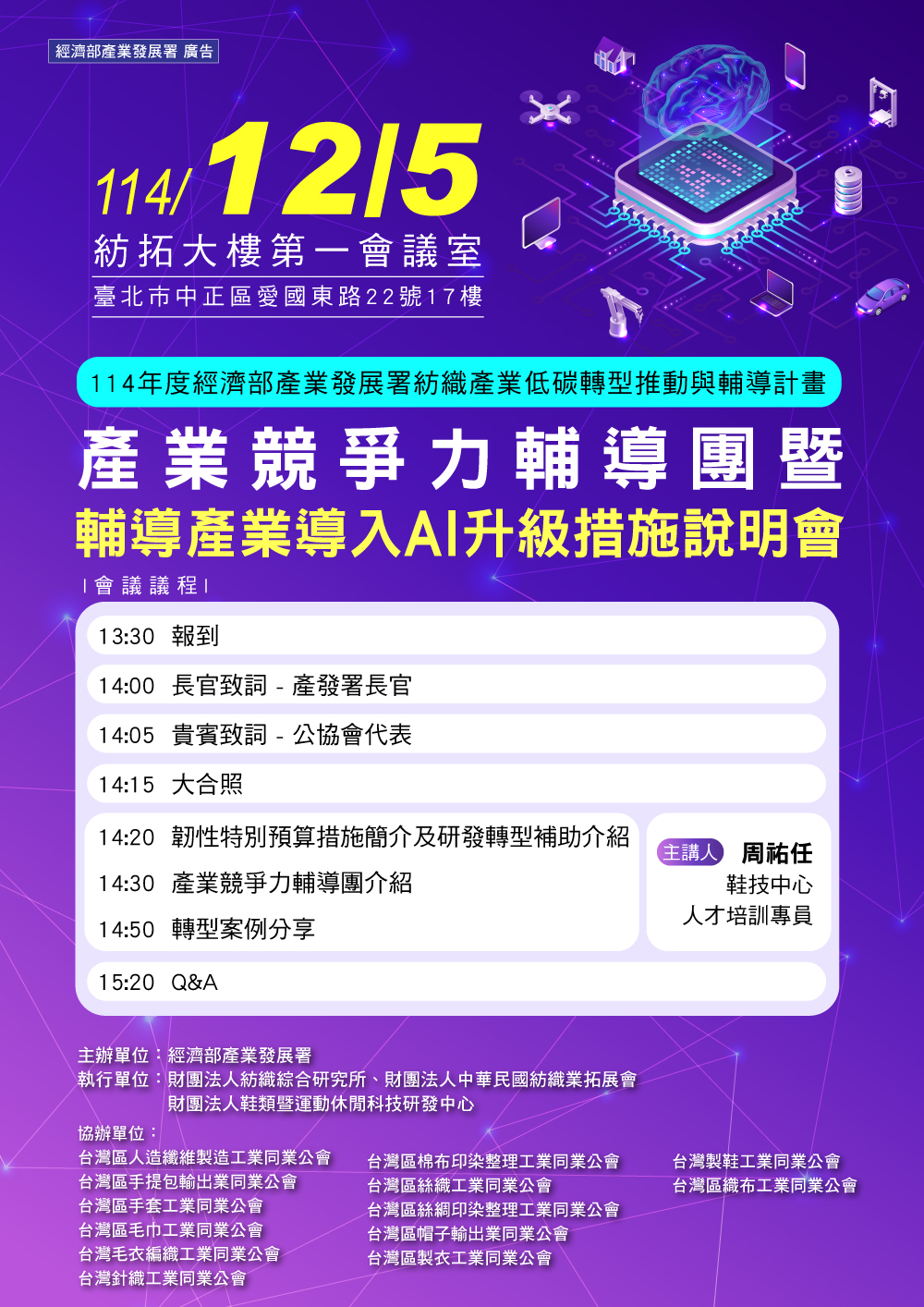 2025.11.19 歡迎報名參加12/5(五) 產業競爭力輔導團暨輔導產業導入AI升級措施說明會 經濟部產發署為協助產業因應美國關稅衝擊,強化我國經濟發展動力及國際競爭力, 於12/5(五)舉辦「產業競爭力輔導團暨輔導產業導入AI升級措施說明會」 時間:114年12月5日(五) 14:00-15:30 >>線上報名 返回列表 下一則